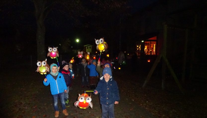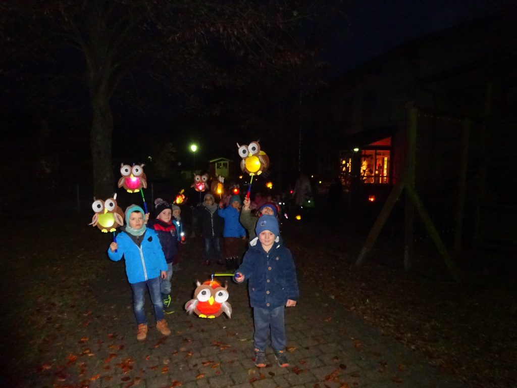 Nachdem die Kinder von Kasperl und Seppel mit der Kasperlegeschichte: „Der Apfel!“ begrüßt wurden, ging es mit selbstgebastelten Eulen- und Igellaternen singend durch die Straßen von Dürrenbüchig.