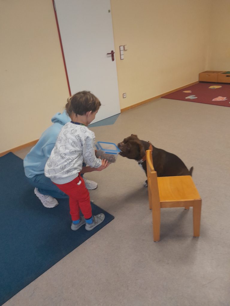 Zunächst wurden natürlich sehr wichtige Regeln und Umgangsformen besprochen. Danach durften die Kinder Julchen kennenlernen, ein Leckerli geben oder sogar einen Trick mit Julchen machen. Für die nächsten Besuche haben die Kinder ein Brettspiel vorbereitet, bei dem Wissen über den Hund vermittelt wird . Julchen wird dabei natürlich mithelfen. Sie würfelt für die Kinder und bringt ihnen auf Kommando Rechenaufgaben aus einer Holzkiste. Es gibt Streicheljoker und Aufgaben bei denen man gemeinsam mit Julchen einen Trick machen darf. Wir freuen uns auf die kommenden Wochen mit Tanja Seewald und ihrem Julchen!